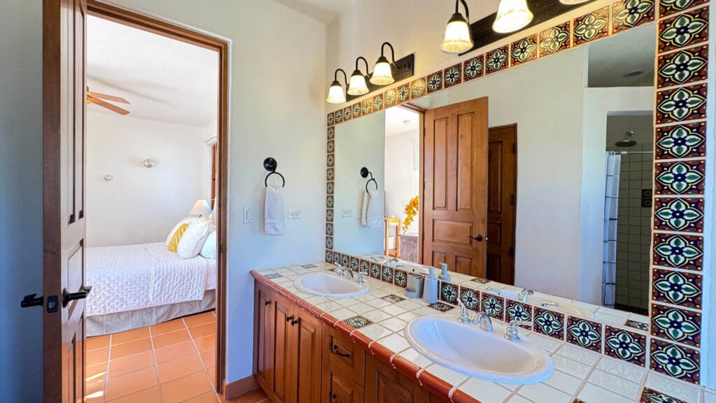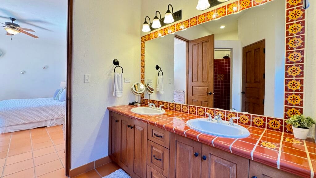 - Full bathroom with double vanity and hallway access for guests