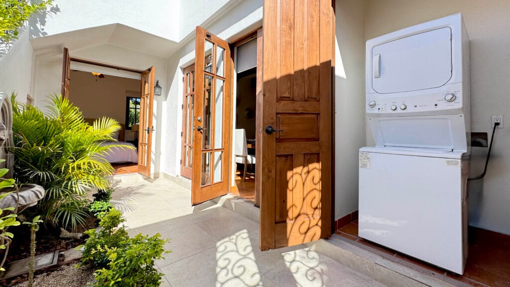French doors open out to a central courtyard, turning it into an extension of your living room. Here you’ll also find washer / dryer and storage conveniently tucked off the courtyard