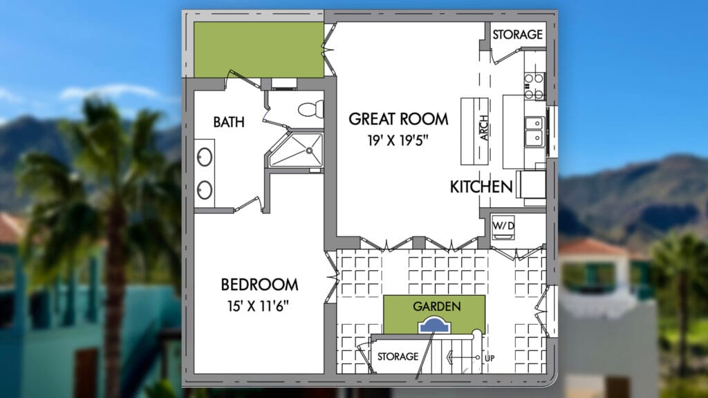 - 1,120 sq ft on the main level, including living areas and courtyard