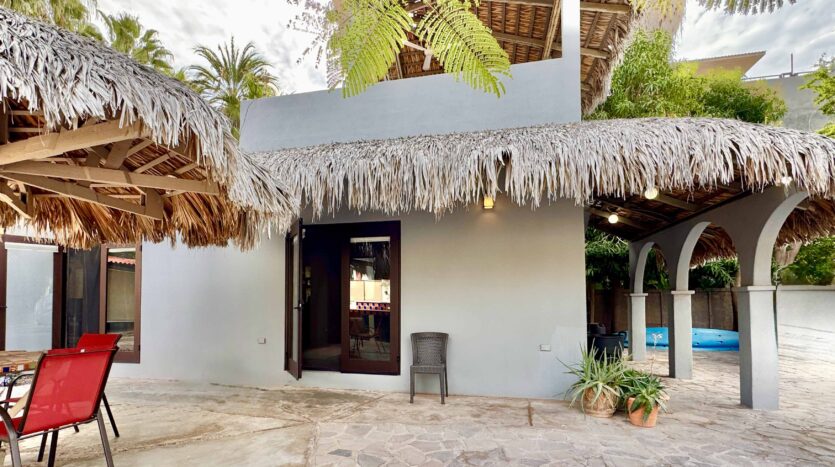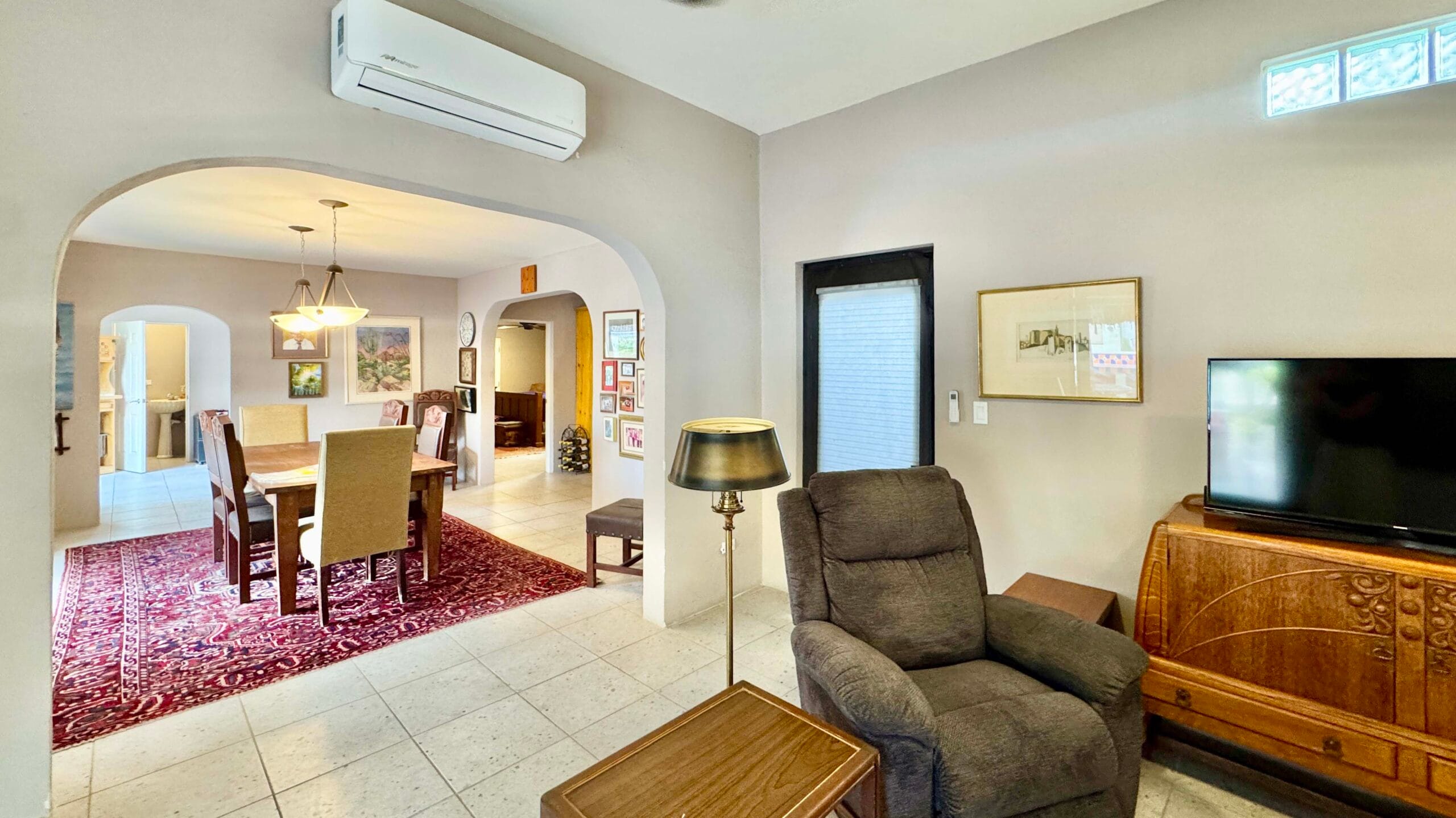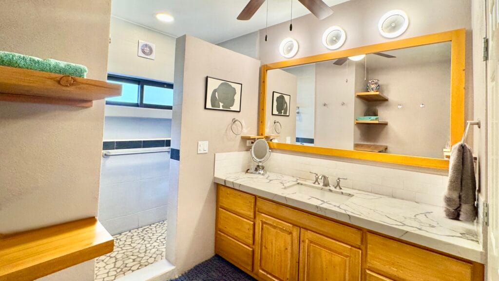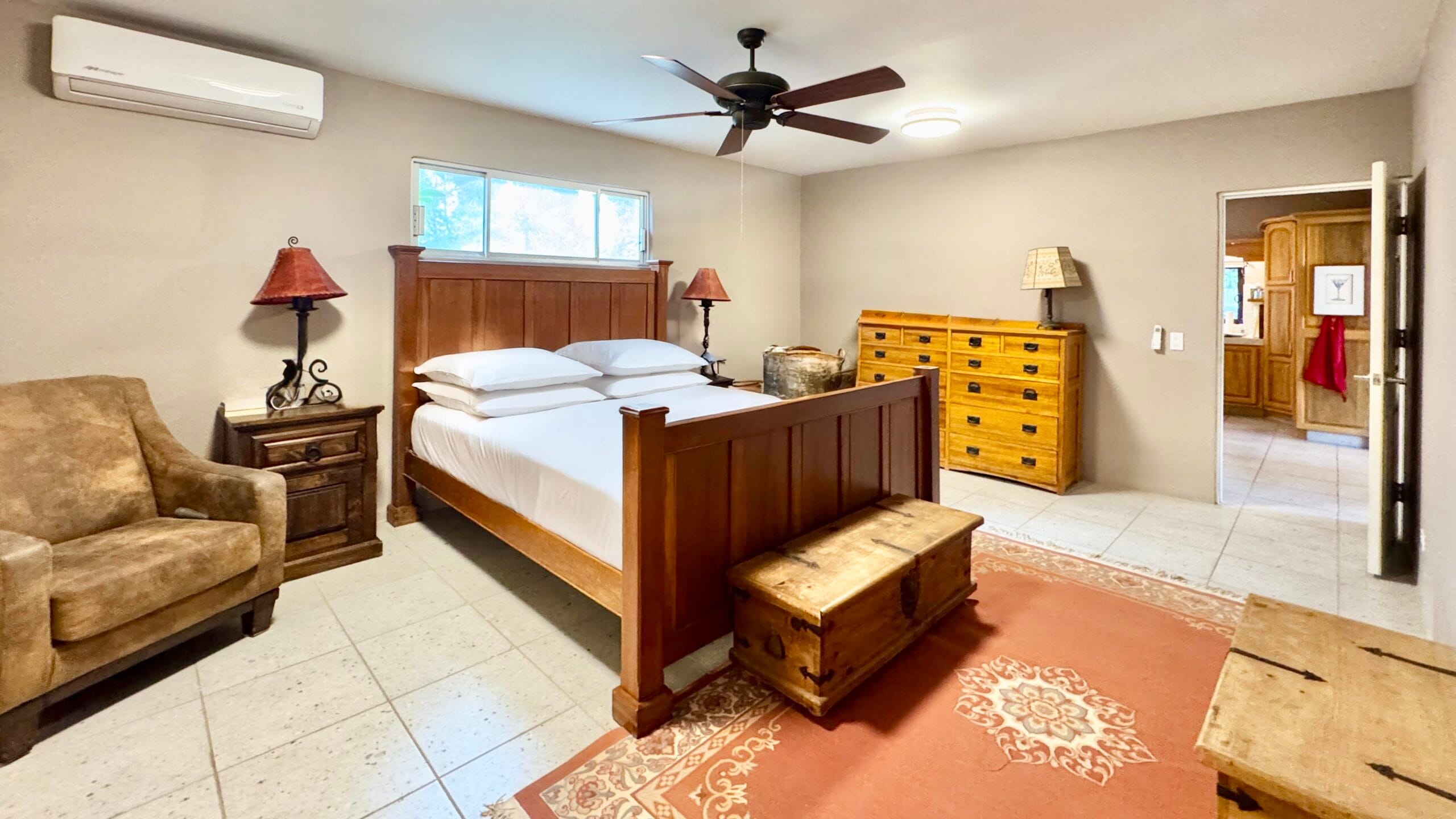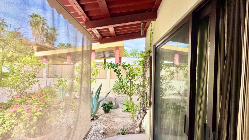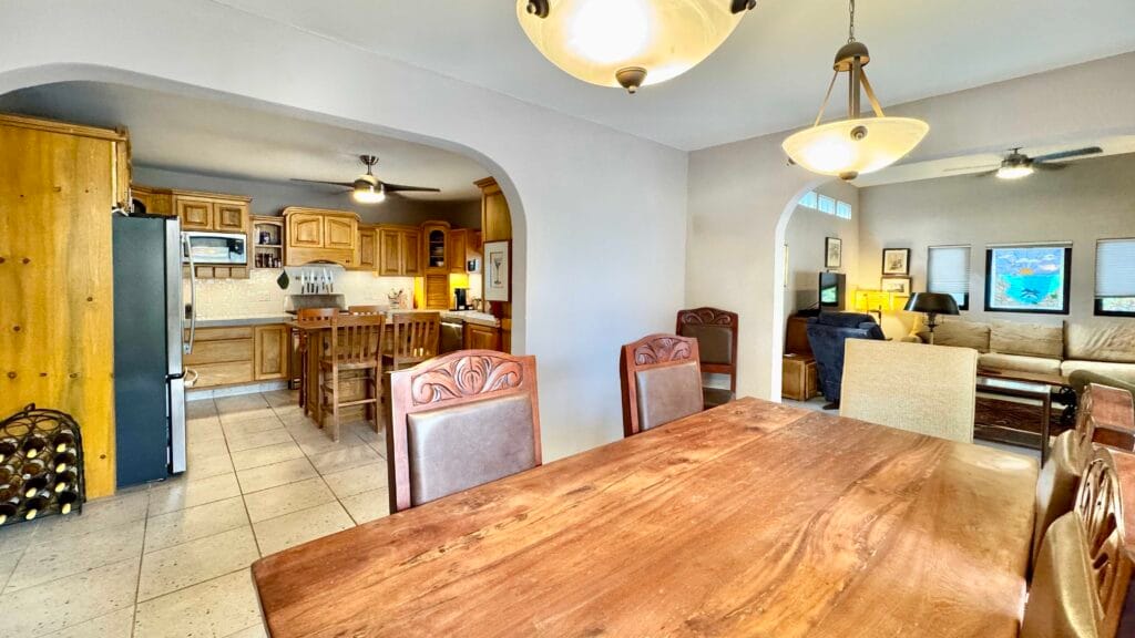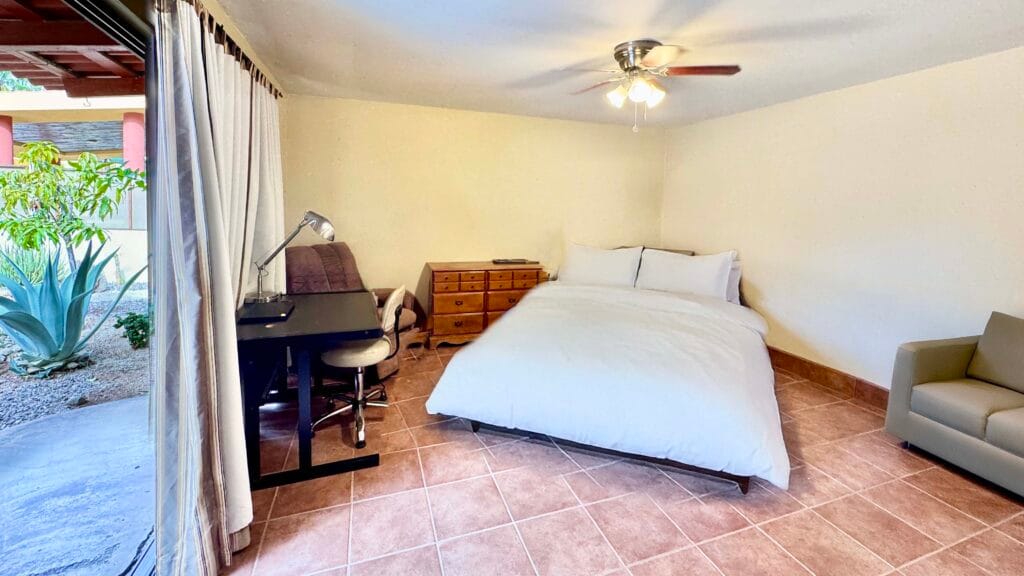 While the main home is configured as a one-bedroom residence, the fully independent guest casita, complete with its own bathroom and walk-in closet, effectively creates a functional two-bedroom, two and a half-bath layout, ideal for visiting family, rental use, or extended stays.