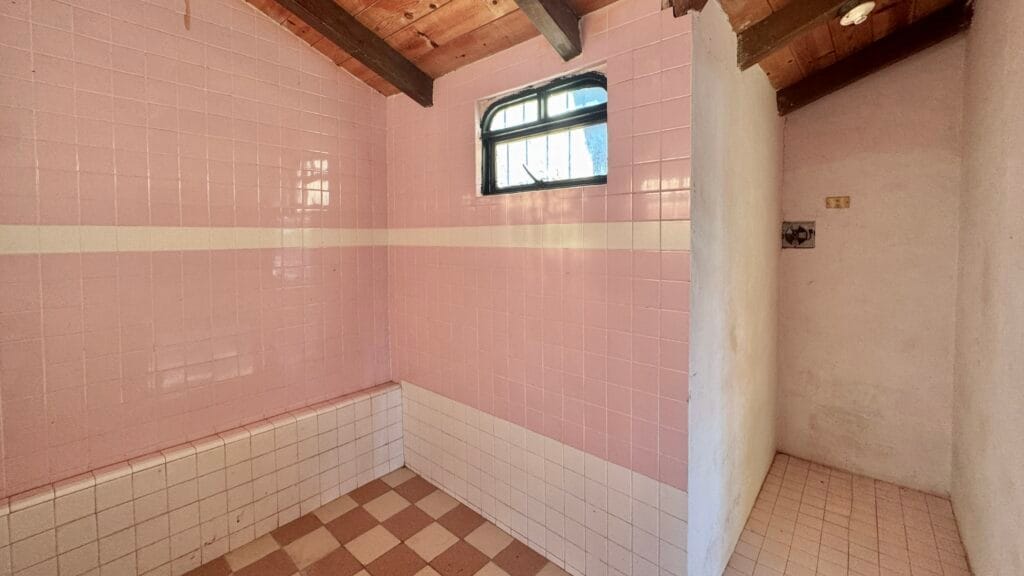 - Another full bathroom, featuring playful pink-and-white vintage tiles that you can either preserve as a statement or update to your taste